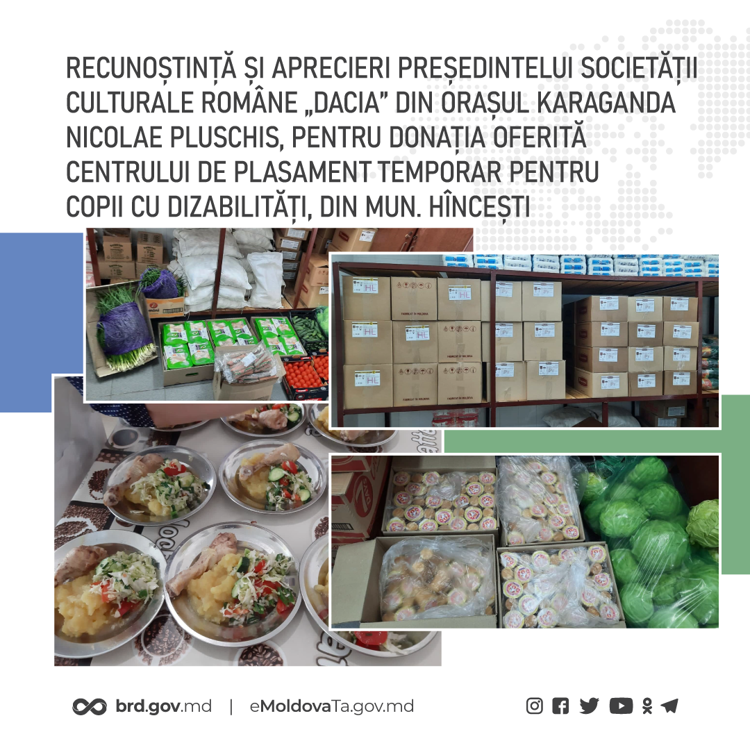 Nicolae Pluschis's gesture full of humanity and generosity contributed to the realization of a soul event for the beneficiaries from Hîncești around the International Children's Day. From the money provided by the president of the Romanian Cultural Society "Dacia" from Karaganda, Kazakhstan, a festive meal was prepared for the 245 beneficiaries of the Center and food was also procured, replenishing the reserves of the temporary placement center for children with disabilities , mun. Hincesti. The total amount of the donation was 27,000 lei.